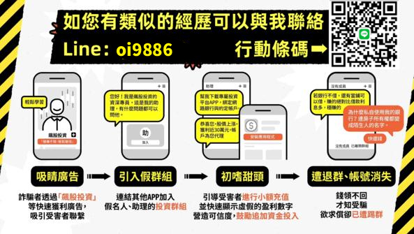 ?希望能用我的經歷提醒更多人避免落入詐騙陷阱也希望更多受害者能勇敢站出來!如果你也和我一樣不幸受騙請聯絡? LINE:oi9886?詢問看看。 E-mail:xuanxuan98961@gmail.com我看到會聯絡的。都是血汗錢,拿回來是最好的。也希望大家能從網友的經歷中汲取教訓,提高警惕。